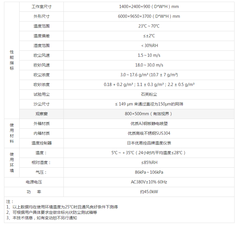 注: 1、以上數(shù)據(jù)均在使用環(huán)境溫度為25℃時且通風(fēng)良好條件下測得 2、可根據(jù)用戶具體要求定做非標(biāo)光伏防塵測試箱等 3、本技術(shù)信息,如有變動恕不另行通知 |