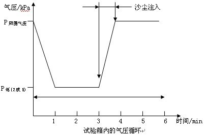 試驗用塵:試驗用塵是干燥的非磨蝕性的細粉塵,能夠通過篩孔為75µm,金屬絲直徑為50µm的平面網(wǎng)狀篩。本試驗中可以使用滑石粉,分析表明它可以滿足要求。試驗用塵使用次數(shù)不應超過20次。應注意維持干燥以保持粉塵細度,使用前應在80℃下烘干2h. 塵濃度:試驗用塵的數(shù)量應能夠使箱底基準表面上的沉降量均勻維持在(600±200)µ/(m²•h)。 氣流:試驗箱內的氣流應主要是自上而下的垂直氣流,而非層流。 氣流速度:氣流速度應能夠使塵在試驗箱內均勻分布。 濕度:試驗箱內的相對濕度應小于15%。可以通過提高試驗箱濕度實現(xiàn)。 樣品內氣壓:根據(jù)樣品的運行條件,樣品外殼可以分為兩種類型: 類型1:樣品外殼內的氣壓可能會與外界大氣壓不同,例如由運行中的熱力循環(huán)引起氣壓不同。 類型2:樣品外殼內的氣壓跟外界氣壓相同。 相關規(guī)范應闡明樣品外殼類型和壓力降。 砂塵試驗箱對于具有類型1外殼的樣品,應放入試驗箱,并按照正常使用位置安裝。樣品應承受圖中規(guī)定的壓降周期。根據(jù)相關規(guī)范中規(guī)定,壓力降應為2kPa(20mbar)或5kPa(50mbar) 。 如圖所示,塵應在每個循環(huán)周期內注入。 對于具有類型2外殼的樣品,應放入試驗箱,并按照正常使用位置安裝。此種情況下,不應使用真空泵。