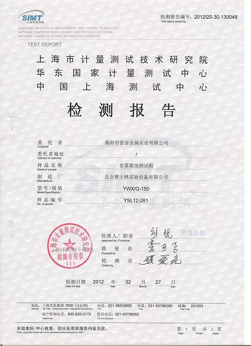 >>鹽霧腐蝕試驗箱檢測報告-上海計量院-富金實業(yè)