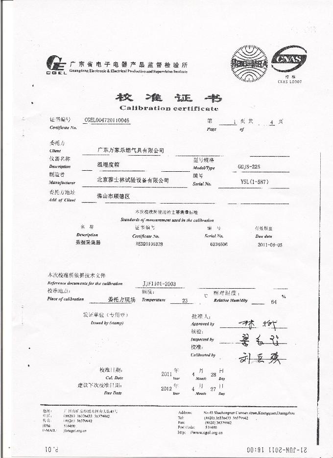 高低溫交變濕熱試驗(yàn)箱校準(zhǔn)證書-廣東檢驗(yàn)所-萬家樂