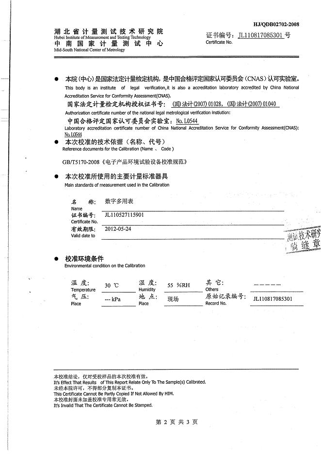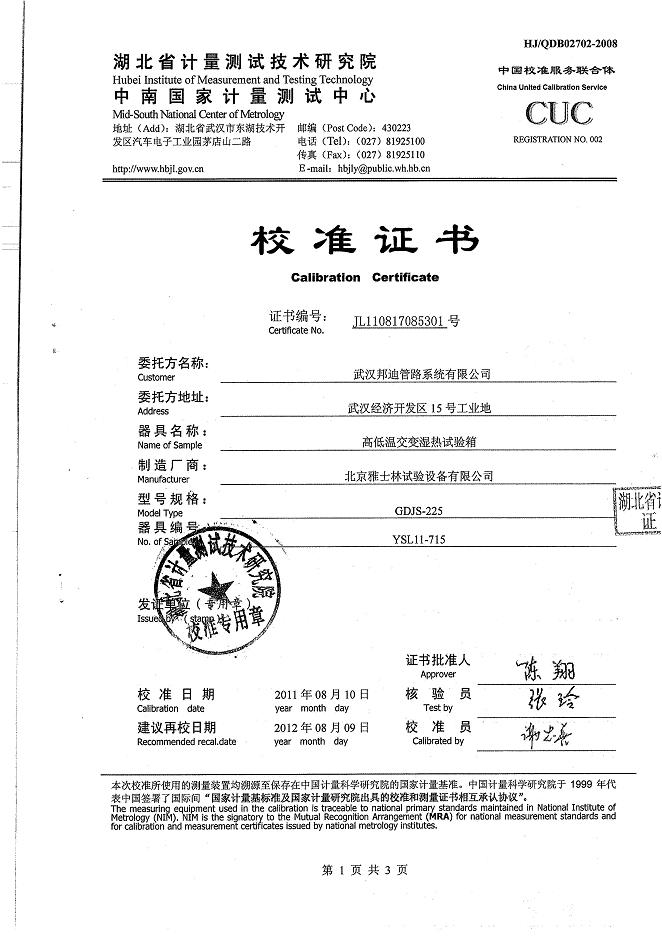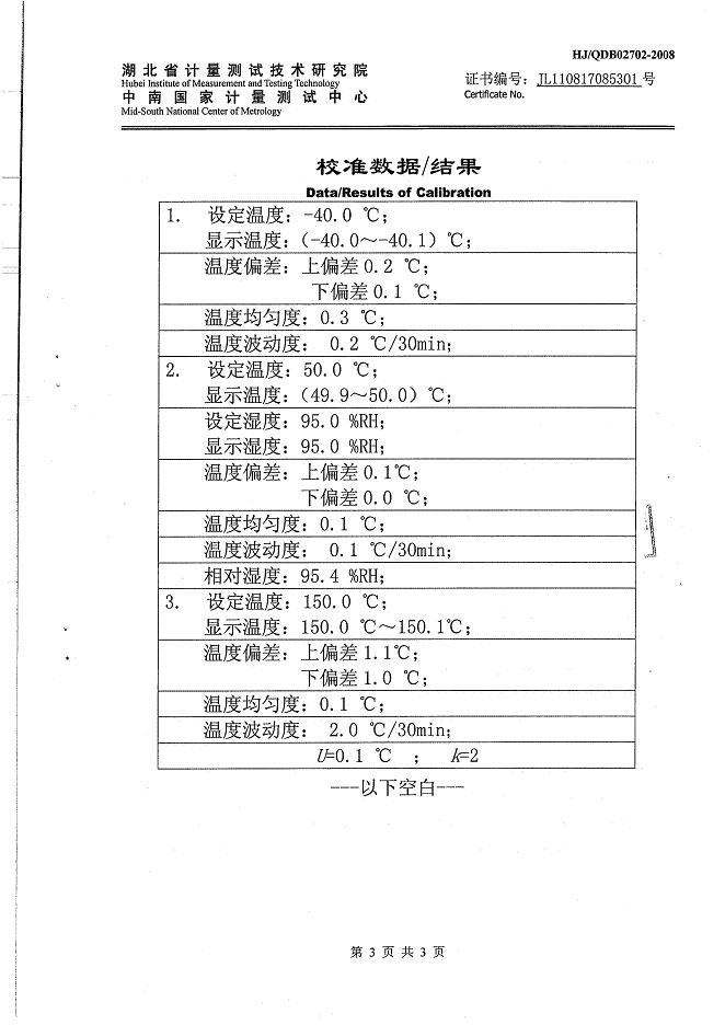 >>高低溫交變濕熱試驗(yàn)箱校準(zhǔn)證書(shū)-湖北計(jì)量院-武漢邦迪