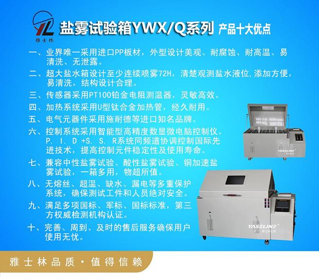 鹽霧腐蝕試驗箱為人工氣候環(huán)境“三防”(濕熱、鹽霧、霉菌)試驗設(shè)備之一,是模擬大氣中含鹽微小液滴所構(gòu)成的彌散系統(tǒng)的設(shè)備。廣泛應(yīng)用在電子、電工及汽車、摩托車、五金工具、化工等產(chǎn)品及零部件、金屬材料與制品的鍍、涂層等進行鹽霧試驗。市場規(guī)模巨大,競爭空前,雅士林YASELINE系列鹽霧試驗箱高起點、高質(zhì)量、高服務(wù),定位于中高端客戶群體,以其過硬的質(zhì)量和完善的售后服務(wù)及良好的市場口碑贏得了中國航天、中國科學院、清華大學、北航、摩托羅拉、ABB、西門子、豐田汽車、中國船舶、北京現(xiàn)代汽車等一系列高端客戶群,其產(chǎn)品具有如下十大優(yōu)點: