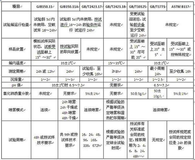 鹽霧試驗(yàn)箱要保證試驗(yàn)結(jié)果的正確性,必須控制好試驗(yàn)過程。試驗(yàn)過程的控制包括:試驗(yàn)箱運(yùn)行檢查、樣品放置、箱內(nèi)暴露區(qū)溫度、沉降液的參數(shù)(沉降量、PH值和氯化鈉質(zhì)量濃度)等,不同標(biāo)準(zhǔn)對(duì)鹽霧試驗(yàn)過程的控制要求見下表: