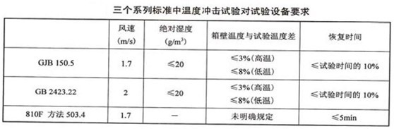 下表中列出了三個系列標(biāo)準(zhǔn)中溫度沖擊試驗對試驗箱的要求,由于都是屬于溫度試驗的范疇,因此其對溫度沖擊試驗箱的要求與溫度試驗箱的要求類似,其主要區(qū)別是增加了溫度沖擊試驗中開箱放入試驗樣品后試驗箱內(nèi)空氣溫度恢復(fù)到規(guī)定試驗溫度的時間要求。